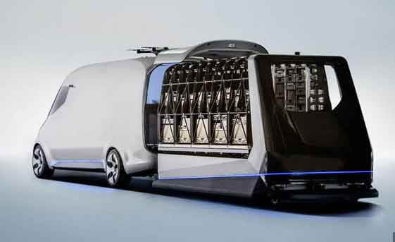 Now let’s turn to what Mercedes calls the Vision Van. A mobile warehouse concept. The German car and truck maker claims that the all-electric van can help boost the efficiency of delivery in urban areas by up to 50%.